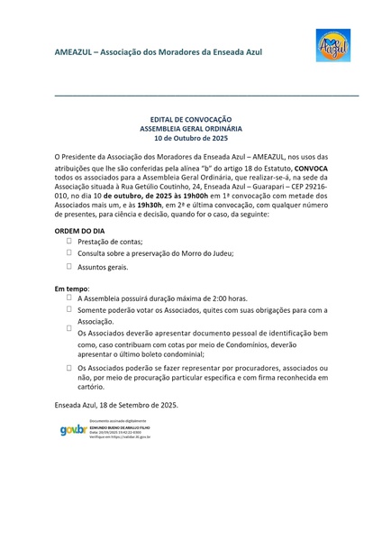 010, no dia 10 de outubro, de 2025 às 19h00h em 1ª convocação com metade dos